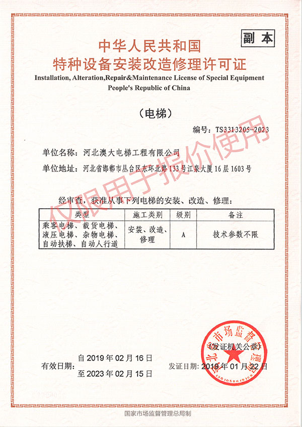 河北澳大電梯工程有限公司是集電梯銷售、安裝、維護保養為一體的專業化電梯公司。公司具有國家質量監督檢驗總局頒發的“電梯安裝改造維修A級”資質許可證。下設市場部、工程部、維保部、技術部、行政部及電梯配件公司。